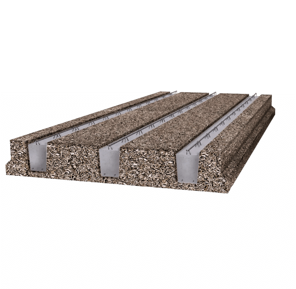 La dalle DS1 Spurgin est une prédalle nervurée en béton de bois avec poutrelles en béton armé. Adaptée aux planchers intermédiaires, dalles sur sous-sol, toiture terrasse et parkings, elle offre une résistance au feu REI 240 et d’excellentes performances acoustiques. La mise en œuvre se fait avec coulage d’une dalle de compression sur chantier.